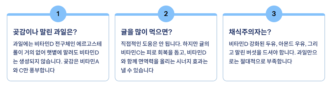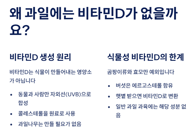 - 팩트 체크: 자연 상태의 일반 과일(사과, 딸기, 귤 등)에는 비타민D가 0에 가깝습니다.