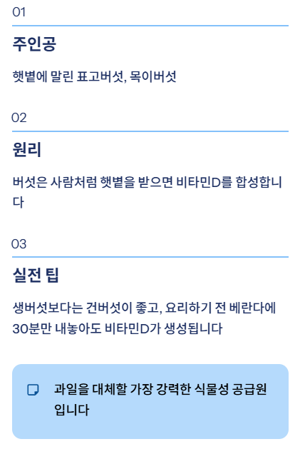 - 원리: 버섯은 사람처럼 햇볕을 받으면 비타민D를 합성합니다.