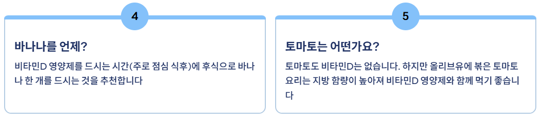 - 비타민D 영양제를 드시는 시간(주로 점심 식후)에 후식으로 바나나 한 개를 드시는 것을 추천합니다.
