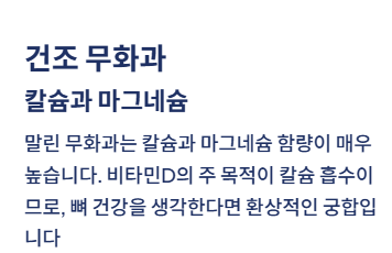 ③ 건조 무화과 (칼슘과 마그네슘) 말린 무화과는 칼슘과 마그네슘 함량이 매우 높습니다. 비타민D의 주 목적이 칼슘 흡수이므로, 뼈 건강을 생각한다면 건무화과를 간식으로 드시는 것이 환상적인 궁합입니다.