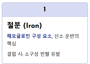 - 결핍 시: 적혈구가 작아지는 소구성 빈혈을 유발합니다.