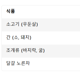 - 최고의 흡수율: 소고기 간, 조개류 (바지락, 굴), 붉은 살코기 (헴철)