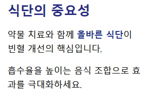 - 식단 활용: 시금치, 콩, 렌틸콩, 해조류 (비헴철)