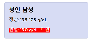 - 헤모글로빈 (남성): 13.5 ~ 17.5 g/dL (정상), 13.0 g/dL 미만 시 빈혈