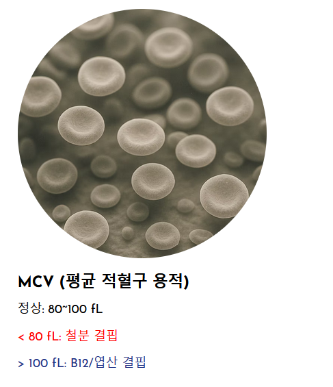 - MCV 지표: 적혈구 크기를 나타내며, 빈혈의 유형(철분, B12/엽산 결핍)을 분류하는 데 핵심적 역할