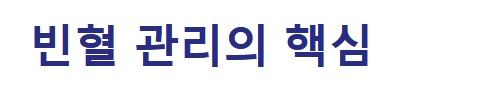 - 만성 출혈: 생리 과다, 위궤양, 치질 등 몸에서 지속적으로 소량의 혈액이 손실되는 경우. (대처: 출혈 원인 치료가 우선)