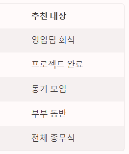 | 단합/열정 | 저기요 | 저기 있는 기쁨을 요기으로 가져오자 | 영업팀, 성과 달성 회식 |