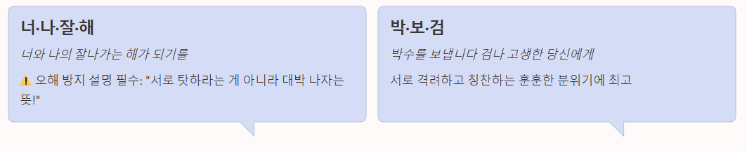 단순한 줄임말보다는 시대의 흐름이나 다가오는 새해의 의미를 담은 멘트가 인기를 끌고 있습니다. 2025년은 '을사년' 뱀의 해이므로 이와 관련된 덕담을 섞으면 아주 좋습니다.