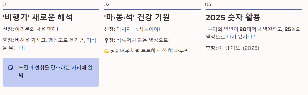 - 해설: 도전과 성취를 강조하는 자리에 적합합니다.