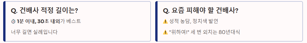- 네, 그렇습니다. 건배사는 1분 이내, 길어도 30초 내외로 끝내는 것이 매너입니다. 잔을 들고 오래 서 있게 하는 것은 건배사의 최악의 유형 중 하나입니다.