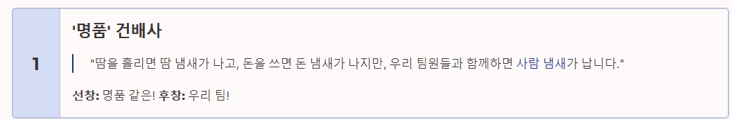 | 감사/격려 | 뚝배기 | 뚝심 있게 배짱 있게 기운차게 | 힘든 프로젝트 끝낸 후 |