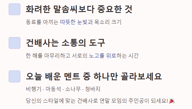 - 멘트: "올해의 성과를 발판 삼아 내년에는 더욱 성장하는 한 해가 되길 바랍니다."