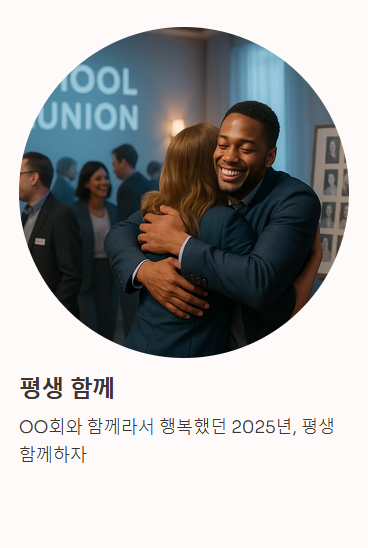 | 동창회 | 따뜻함, 향수, 편안함 | 우정, 청춘, 추억 | 복고풍(칠판, 교복) 또는 꽃무늬 |