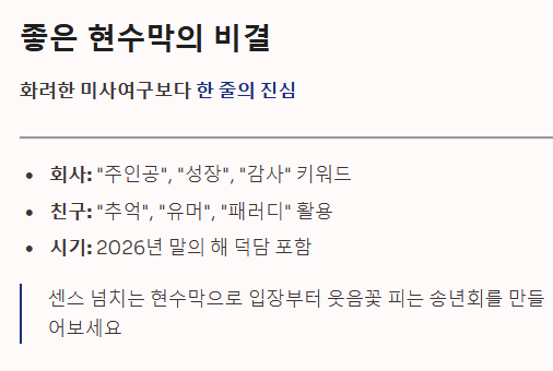 - 시기: 12월 중순 이후라면 2026년(말의 해) 새해 덕담을 함께 포함