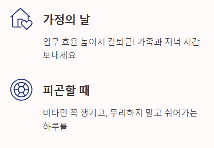 | 가정의 날 | "오늘은 즐거운 가정의 날 수요일입니다. 업무 효율 높여서 칼퇴근하시고, 가족 혹은 자신을 위한 저녁 시간 보내세요!" | 칼퇴근, 저녁 있는 삶, 힐링 |