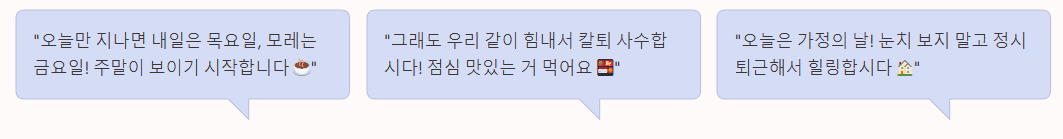 - "오늘은 '가정의 날' 수요일! 눈치 보지 말고 정시 퇴근해서 힐링합시다. 오전 업무 후딱 끝내버리자고요. 아자아자!"