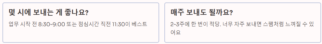 A. 보통 업무 시작 전인 8시 30분~9시 사이가 베스트입니다. 하지만 수요일은 업무가 몰리는 경우가 많으므로, 점심시간 직전(11시 30분)에 "맛점하세요"와 함께 보내는 것도 추천합니다.