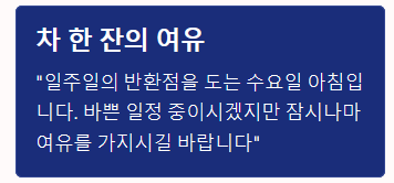 - "OO 부장님, 일주일의 반환점을 도는 수요일 아침입니다. 바쁜 일정 중이시겠지만 잠시나마 차 한 잔의 여유를 가지시길 바랍니다. 오늘 하루도 건승하십시오."