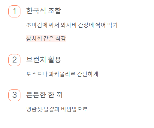 - 한국식 조합: 조미김에 싸서 와사비 간장에 찍어 먹으면 참치회와 비슷한 맛이 납니다.
