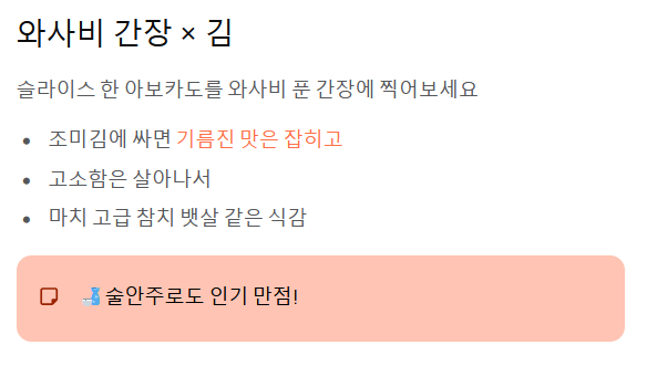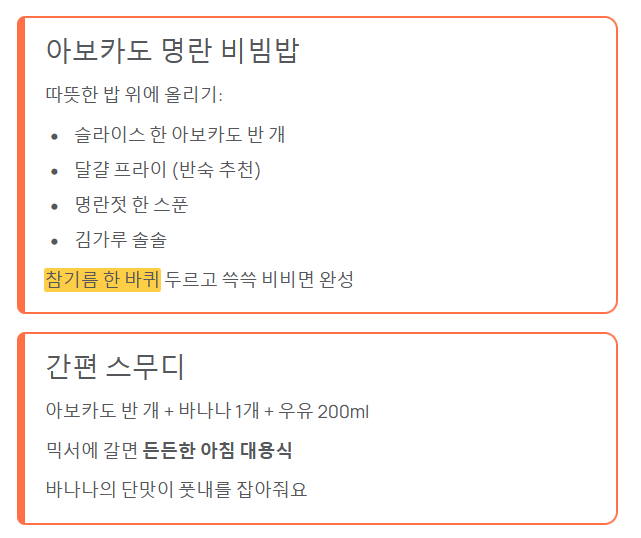 아보카도는 단순히 샐러드에 넣어 먹는 것 외에도, 간장에 찍어 회처럼 즐기거나 밥에 비벼 먹는 등 활용법이 무궁무진합니다. 특히 '김+간장' 조합이나 '명란+참기름' 조합은 한국인의 입맛에 실패 없는 선택이 될 것입니다.