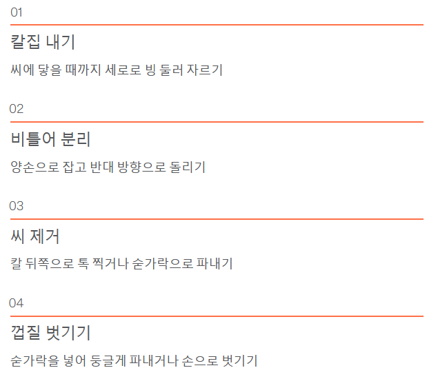 - 씨 제거: 칼 뒤쪽(턱)으로 씨를 '톡' 찍어 비틀어 빼거나, 숟가락을 씨 밑으로 넣어 파냅니다. (칼 사용 시 손 조심 필수)