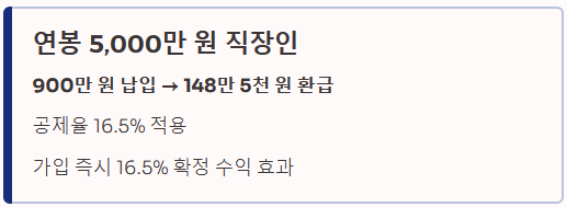 - 연봉 5,000만 원 직장인: 900만 원을 꽉 채워 납입하면 16.5%를 적용받아, 연말정산 때 지방소득세 포함 약 148만 5천 원을 돌려받거나 낼 세금에서 깝니다. 수익률로 따지면 가입하자마자 16.5%의 확정 수익을 얻는 셈입니다.