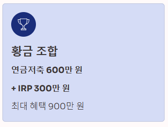 - 한도: 연금저축 600만 원 + IRP 합산 최대 900만 원