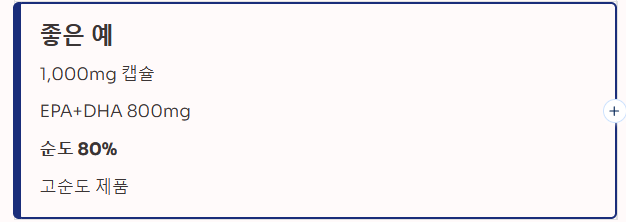 - 좋은 예: 1캡슐 1,000mg인데, EPA+DHA 합이 800mg = 순도 80% (고순도 제품)