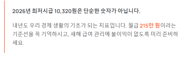 💡 체크 포인트 월급이 약 215만 원을 넘어야 법적 최저 기준을 충족합니다. 2026년 근로계약서 작성 시 이 금액보다 낮은 기본급은 법 위반이 될 수 있으니 주의하세요.