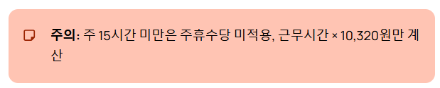 - 주 15시간 미만(초단시간 근로자)은 주휴수당이 없으므로, 단순히 근무시간 × 10,320원만 계산하면 됩니다.